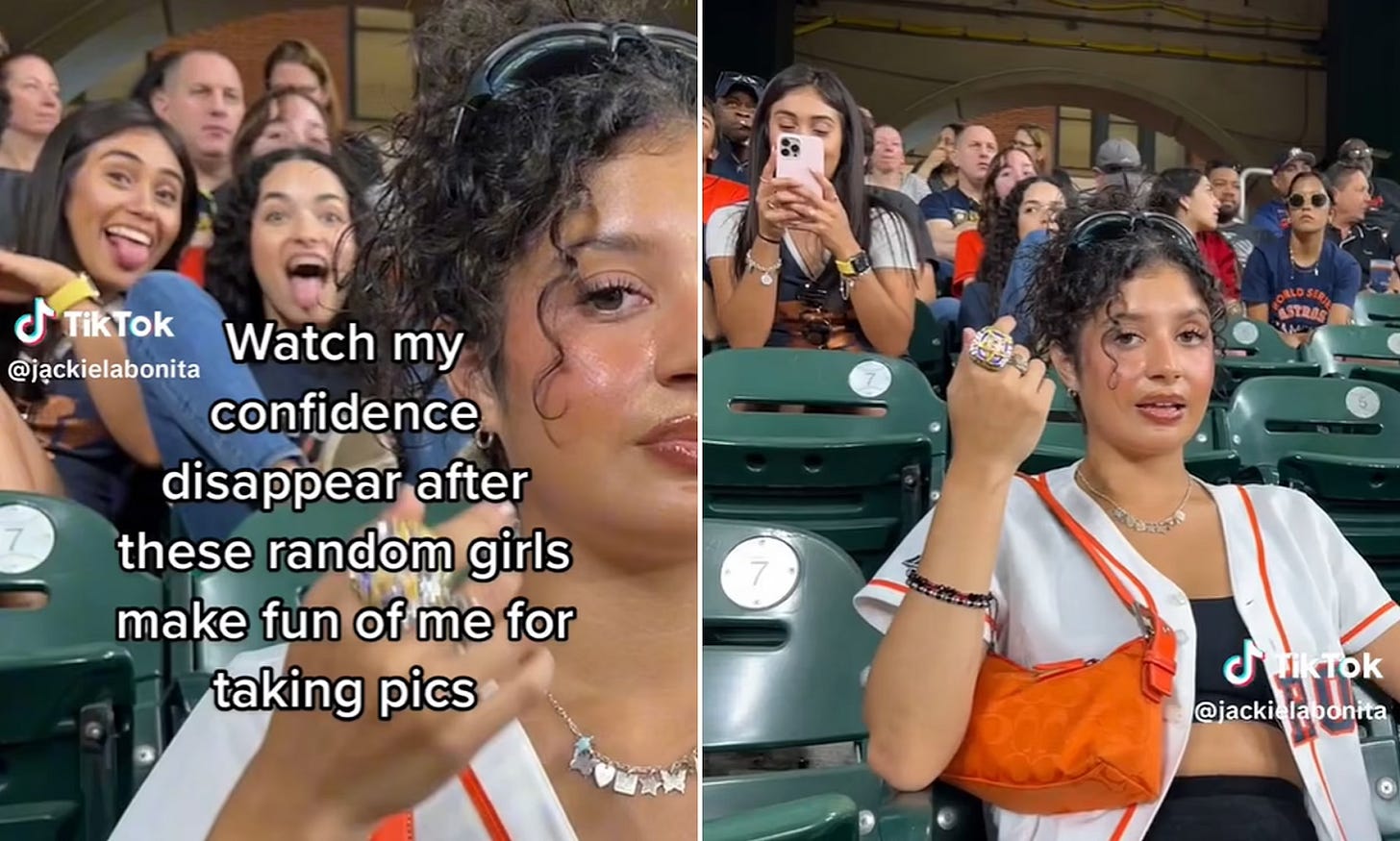 there’s a dark side to the freedom the internet allows. the anonymity and detachment from the real world the internet provides is erasing the humanity of those around us. go on twitter or tiktok and scroll for a while, i promise you it won’t be long until you stumble across a video or image of someone recording a stranger- often without their consent. i remember earlier this year a tiktok influencer by the name of jackielabonita posted a video of her trying to get pictures at a sports game, when some girls behind her started mocking her.